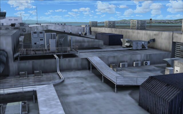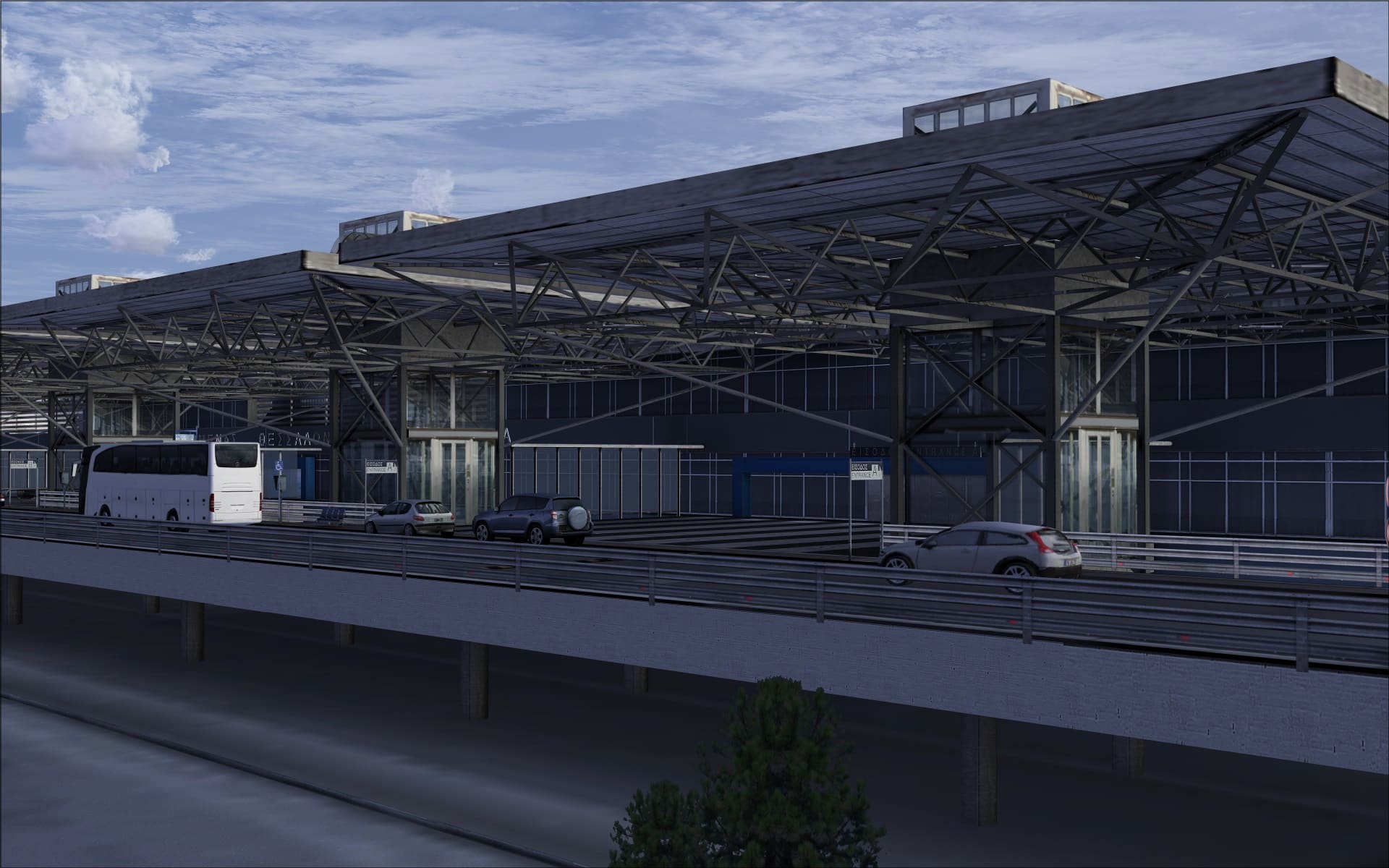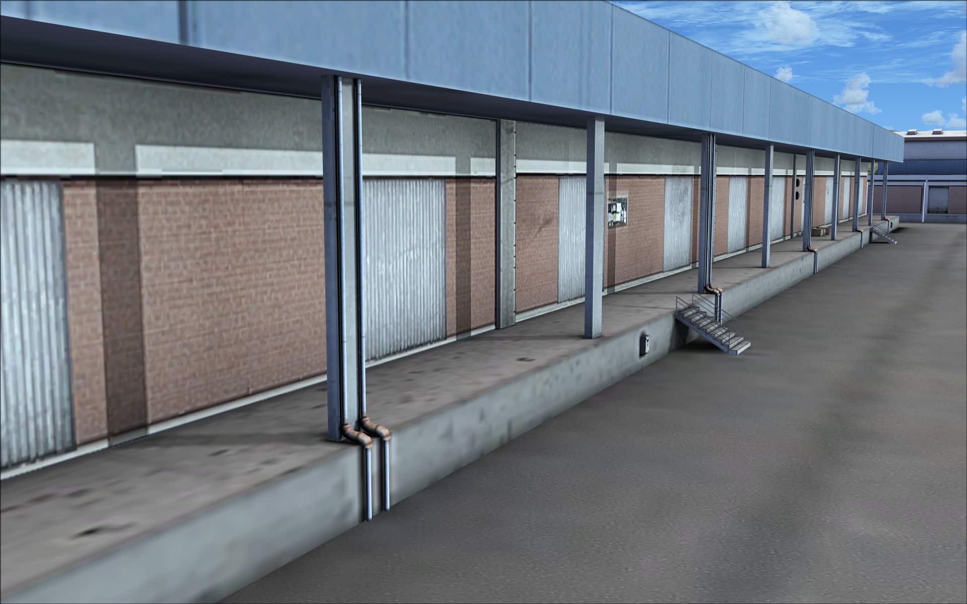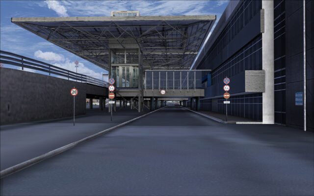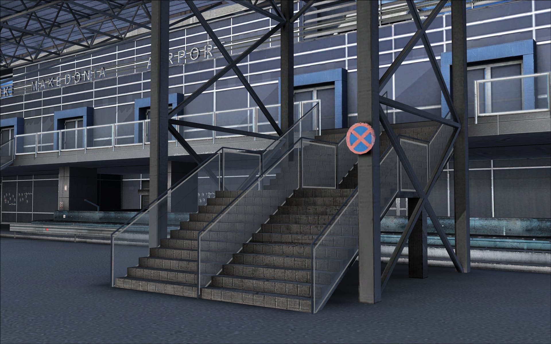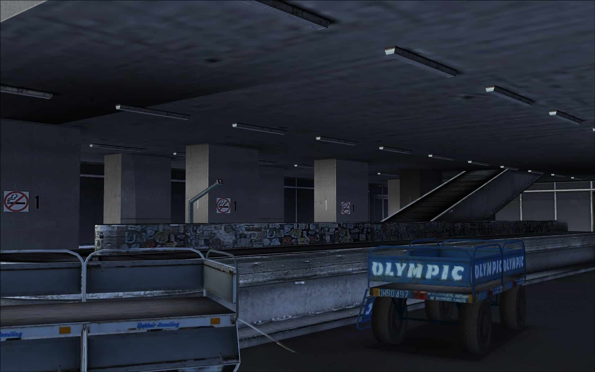 The most prominent feature of the structure I believe is the network of exposed metal bracing used to support the metal roof overhangs. These overhangs extend the entire length of both the apron side and arrivals side of the building. The amount of work that went into the modelling of this intricate web of metal beams must have been extreme. I especially loved how it looked from the vantage point of sitting in an aircraft cockpit. But having said that it looked great from any distance or angle. If you look past this feature you will see that they’ve taken a great deal of care in also modelling the multiple stairways that lead from the ground level to the second floor. The metal railings and glass panels along with being able to distinguish individual tiles on the stair treads is impressive and the attention to detail doesn’t stop there. Underneath the main structure they’ve added the baggage conveyors and included the start/stop buttons that control the belts movements. This is just a short list of what they’ve included.