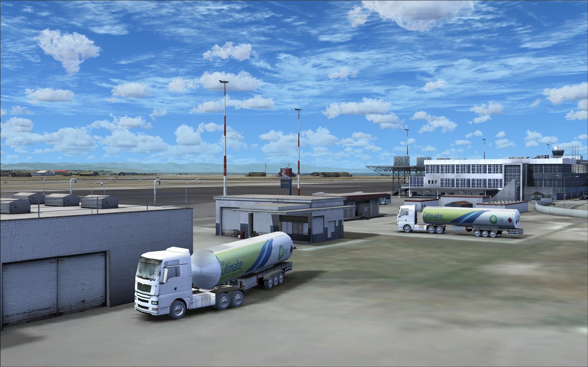 The scenery includes a number of subtle animations. Vehicular traffic both at the airport and on the nearby roadways is the predominant one. On the airport apron and service roads we see the usual array of service vehicles travelling around which is pretty standard stuff. On the roads just outside the airport and leading up to the terminal building there is a nice variety of personal and commercial vehicles as well. The quality of all of these vehicles is very good.