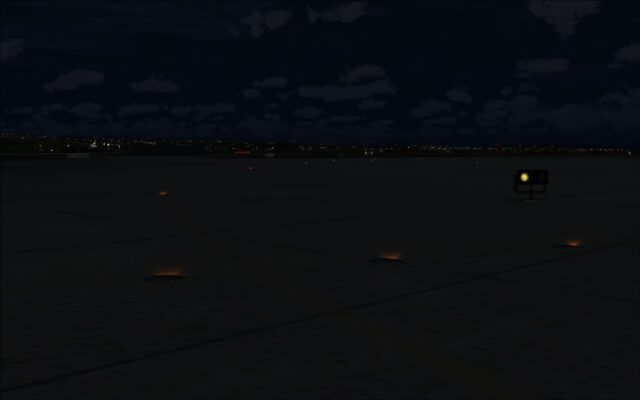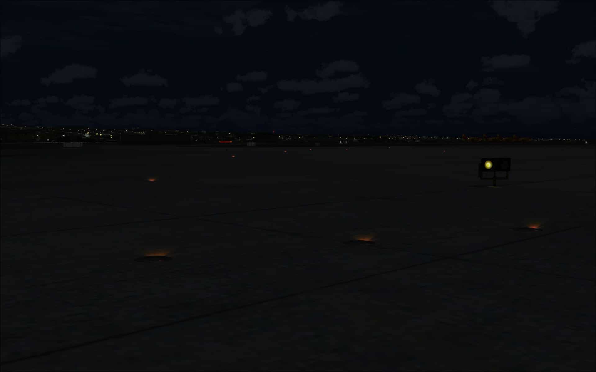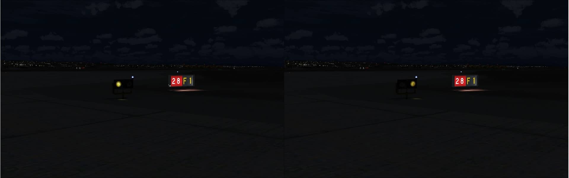 Runways/taxiways/aprons are a great area to look at night lighting because there are so many different types of lights used. From the lighting of the runway/taxiway markers, PAPI lights, elevated lights, inset lights, etc each has its own unique features and projects light in a slightly different way and those characteristics were portrayed vary convincingly. Here are a few screenshots that highlight this aspect of their work. Notice in the two-part screenshot how the yellow light cast on the ground follows the light in the fixture. The same screenshots also show how the runway marker is casting a glow on the ground directly in front of the sign.