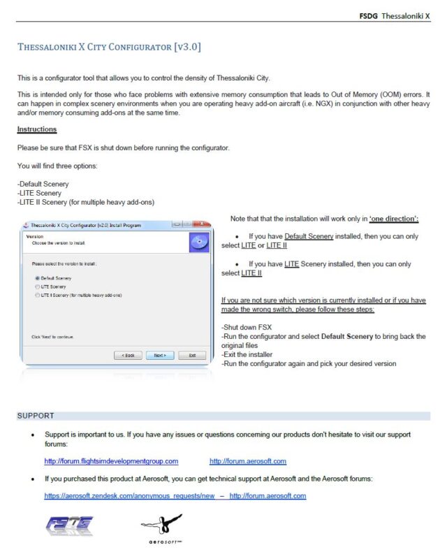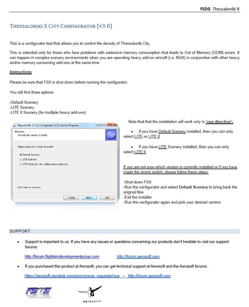 The installer allows the product to be installed in: FSX, P3DV1 or P3DV2. This appears to be a growing trend and one that is very welcome for many. I installed the product in FSX. The installation process is very simple and only requires you choose your simulator and add your registration information. The installer will do the rest, upon completion you will have three new entries in your FSX scenery library and a new entry in your program group; Aerosoft – Thessaloniki X – FSX. From this menu you can access the various scenery utilities, manual and uninstaller. You are now ready to go.