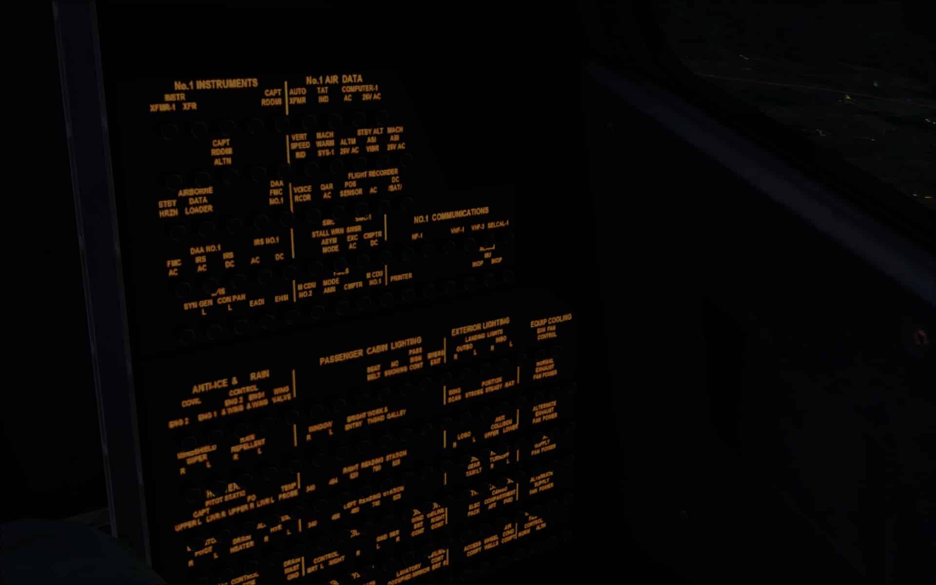 Night lighting in the 737 cockpit was very good. In this aircraft you have the ability to smoothly adjust the intensity level of both the panel lighting and the flood lighting in every area of the cockpit panels.