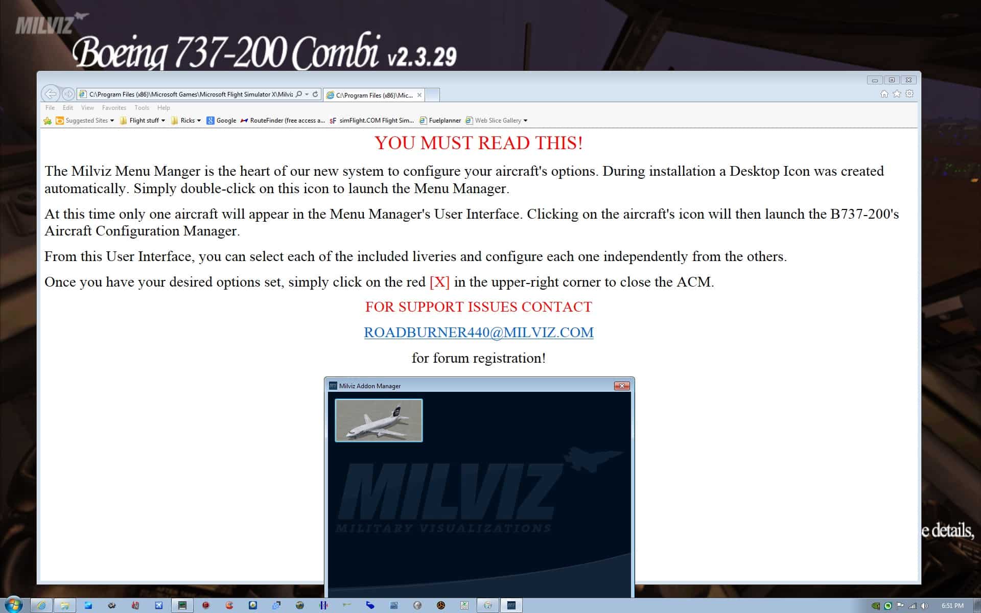 Documentation: Very good. Informative including Boeing and Milviz custom documents.