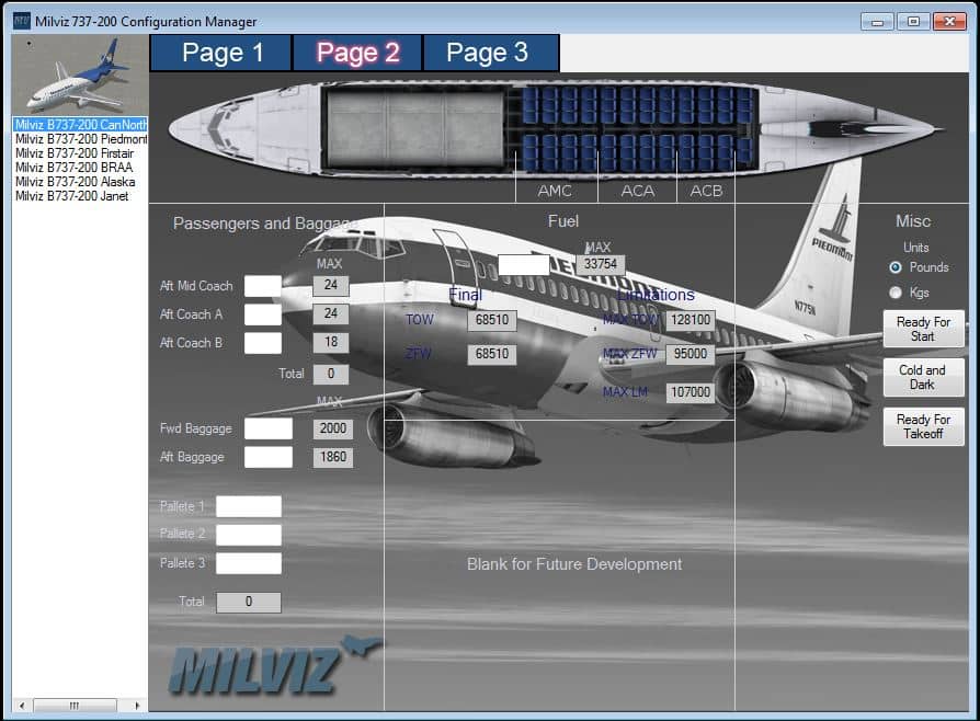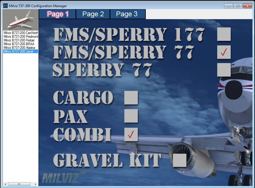The first page allows you to choose your livery and how each is configured. The choices are; passenger, combination or freight. Each one of these can also be fitted with the gravel kit. This is also the page where you will make your choices as they relate to the autopilot and FMS. The choices are: Sperry 77, FMS/Sperry 77 and FMS/Sperry 177.