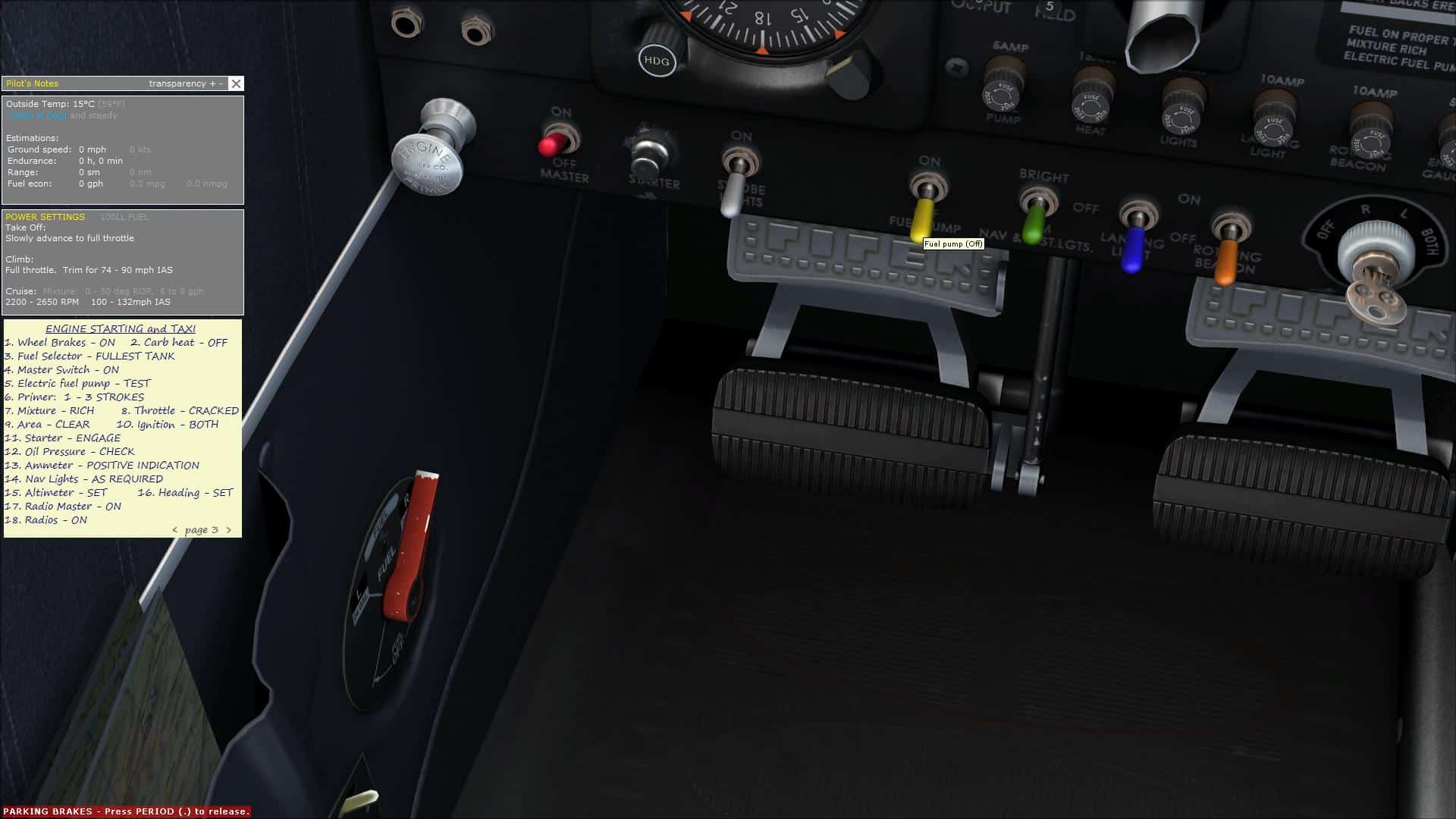 In order, shift-2 will bring up the Pilot’s Notes window; a handy little guide to the aircraft in terms of its performance at any given time (plus how comfortable you and your passengers are!) but also providing power setting advice and five pages of checklists. Useful if you don’t have a set of paper ones, from a real aircraft.