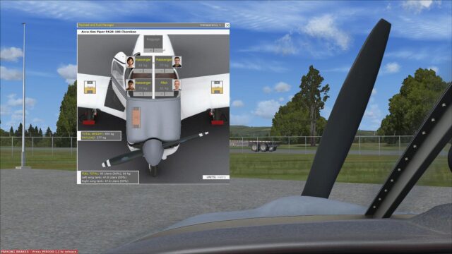 As with other more recent Accu-Sim models, the PA-28 features a number of optional components that can be added to or removed from the aircraft. Not just the passengers, fuel and oil – I’ll cover them later – I’m referring to physical airframe and operational components of the aircraft.