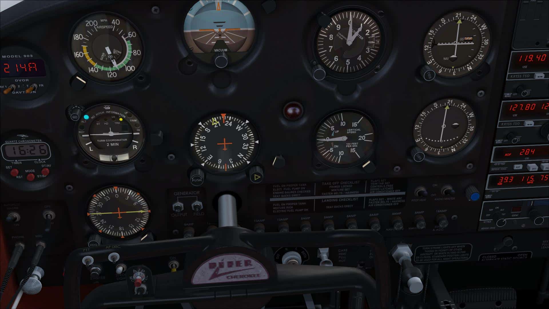 Whether hand flying or on the autopilot, there’s one task in the cruise which is essential here, but with which most simulator pilots will be completely unfamiliar. You must – not optional – swap between fuel tanks in the cruise, using the selector down by your left ankle on the cabin sidewall. The reason for this is that the Cherokee’s fuel pump will only ever draw from a single tank at a time and thus will only drain the single selected tank at a time. This is a common feature of low-wing GE aircraft that most developers do not fully simulate, but this is Accu-Sim, so of course it is there and you don’t have the option to cheat and leave it on “all” simply by not selecting a tank. Should you fail to do so, the obvious problem is simply running out of fuel which, if you’re not watching the fuel gauges, will probably take you by surprise when the engine starts giving up the ghost in a spectacular way. The other problem is that you’ll end up with a significant imbalance, with the aircraft desperate to roll into the fuller tank. Needless to say, by managing this imbalance by regularly switching tanks, you’ll also resolve the running out of fuel issue – provided you put enough in for your flight, anyway.