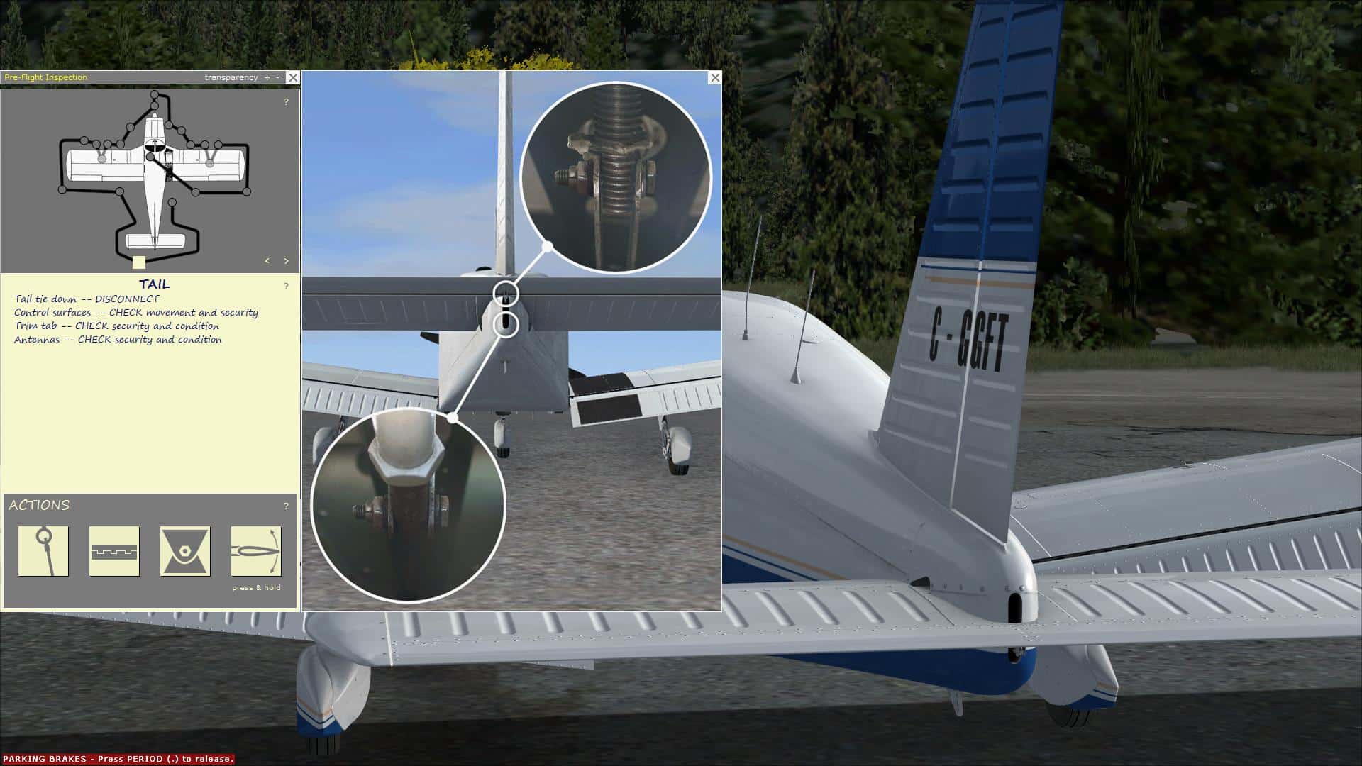 That discussion leads nicely on to the walkaround as well, because almost all of those broken bits or unwanted occupants are modelled when present and the developers have cleverly used external camera viewpoints during the walkaround, as well as the 2d pop-up windows, allowing you to actually do the checks. There are several animations included as part of this, such as movement when checking the flaps and trim tab, as well as removable/replacable items such as the pitot head cover, tie-downs and the aforementioned tape, rags, etc.