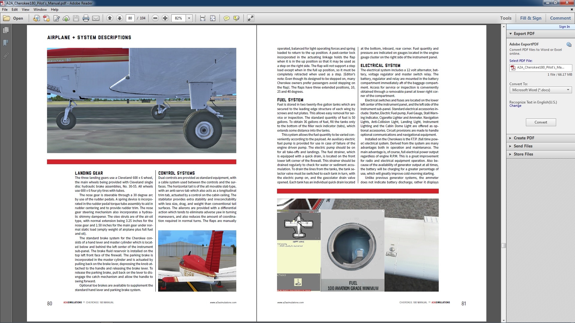 Weighing in at a more than significant 104 pages, the Adobe PDF format documentation for the Cherokee 180 is far more than just an operation manual. The first third is taken up with a very in-depth analysis of the PA-28, its origins, comparisons with other aircraft and suchlike. While this will appeal to many aviation enthusiasts, it’s a bit of a slog for those who aren’t that interested, especially if they don’t agree with some of the tone of the writing, suggesting that the Hershey Bar winged PA-28 is pretty much the epitome of the perfect GA aircraft.