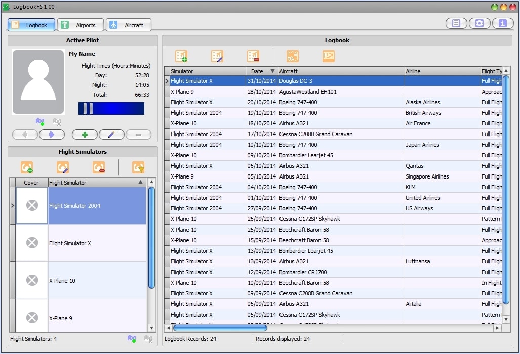 Log your flights of different simulators (FSX, FS9, X-Plane … ) with the same tool. Keep track of your flights origins and destinations, and display them on the included maps.