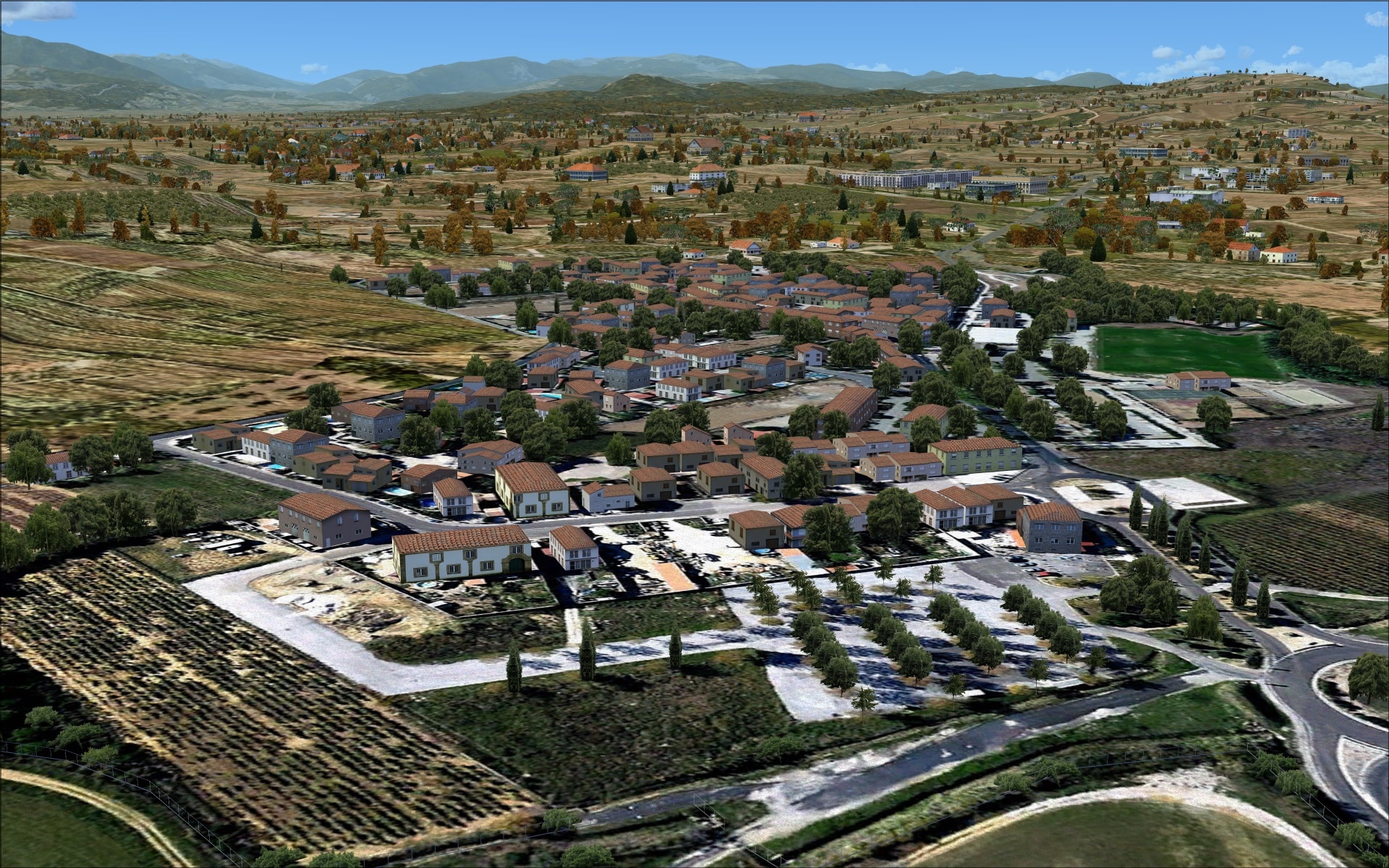 Included as part of the scenery coverage area is the adjacent commune of Peyrestortes located just north of the airport. It consists mostly of single storey residential units. These have been modelled using generic structures on a photo image base. This adds a little something to the immersion factor when inbound to runway 15.