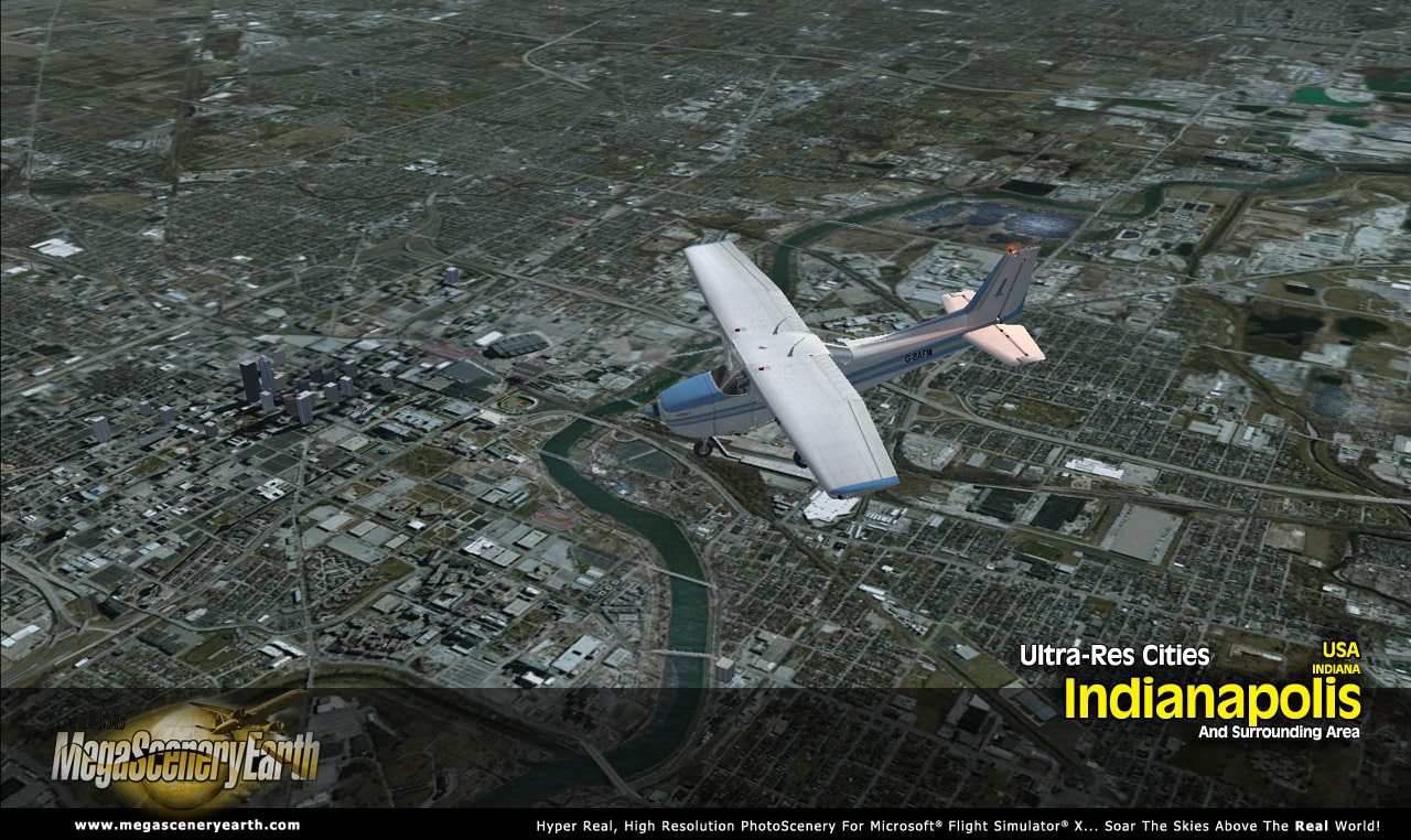 MegaScenery Earth Ultra Res City IndianapolisUltra-Res Cities products feature the highest resolution of photoreal textures that you will find in a MegaScenery area. For the same reason, the covered area is restricted to the the city and its region where you can fly as low as 500ft AGL and the terrain display remains clear.
