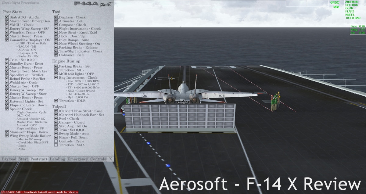 First of all, it has to be said there is no full 2D panel for the Tomcat. All flying will have to be done from the VC. There are some 2D popup-panels though. One bundles most of the available RIO-weapons controls as well as some hard to reach pilot controls on an easy-to-use 2D panel, so you can make better use of the F-14’s features while still flying it. The other 2D panel bundles a lot of functions related to operating the aircraft: selectable options, payload manager and automated checklists. One very nice feature I want to highlight from the available options is the ‘Mini-HUD’. This provides you with a screen overlay that displays some basic info along the top of your screen. Info concerning the engines, basic flight controls systems, the autopilot,… While not realistic, it makes handling the F-14 much easier. I found myself running with the mini-HUD enabled almost all the time.