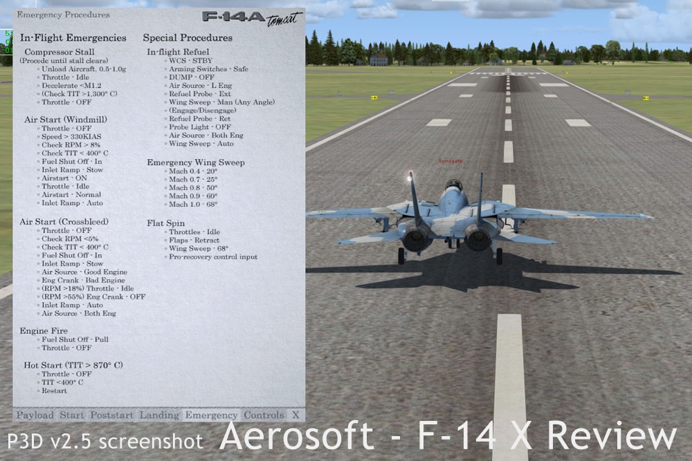 Documentation for the Aerosoft F-14 X comes in the form of 7 pdf-documents. These documents cover just about everything you need to get going in this aircraft. From how the aircraft is implemented in FSX (or P3D), over all cockpit systems and controls, to weapon systems and carrier operations. The documentation is very accessible and readable, and does a very good job of getting you started in the Tomcat. What I am missing, is a bit more in-depth information on the systems, and the weapon systems in particular. Also, there’s almost no information on the deployment of air-to-ground weapons.