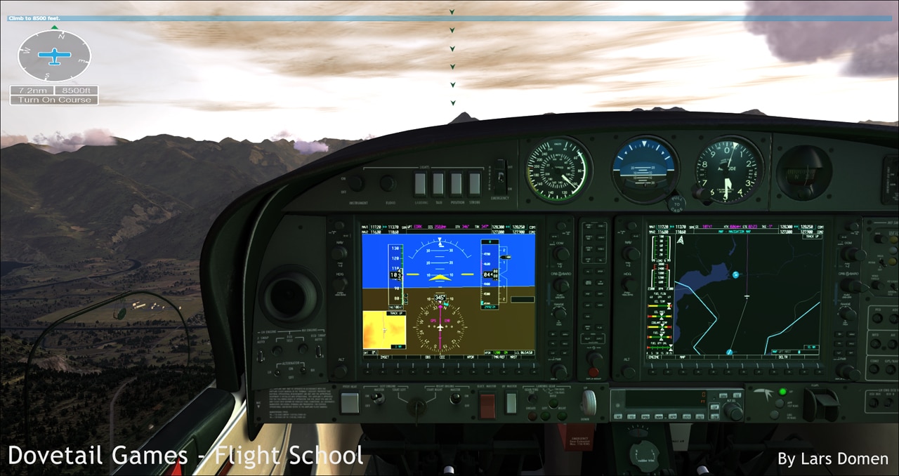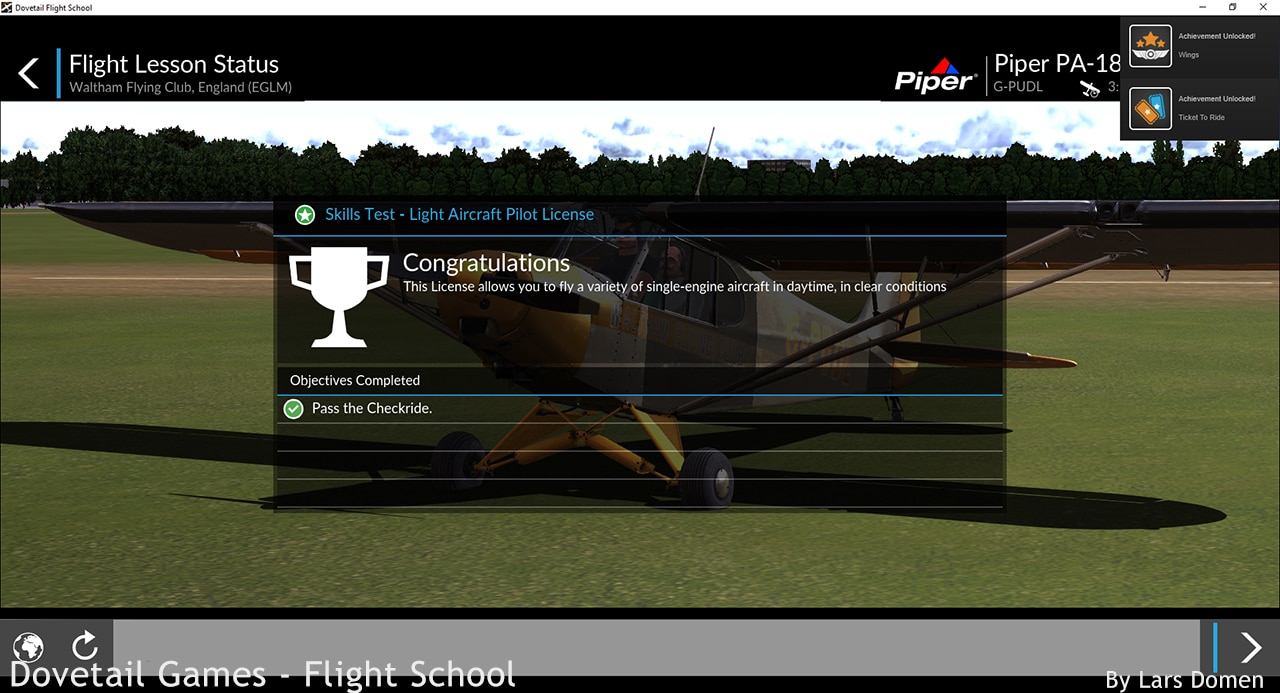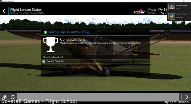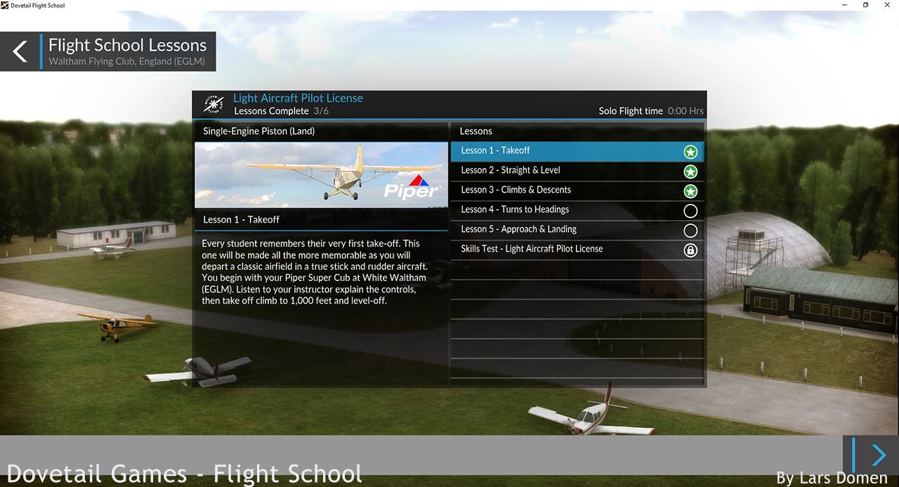 On the aspect of getting you in the air, Flight School has a Free Flight mode as well as several missions of varying length and difficulty. But most importantly, it comes with 2 (3 if you have the DA-42) series of lessons. The first using the Piper Super Cub teaches you some (very) basic flying skills, and grants you a virtual ‘Light Aircraft Pilot License’ upon completion of the 5 lessons and the ‘skills test’. The second uses the Cherokee and gives you a virtual ‘Private Pilot License’ after 8 lessons and a checkride.