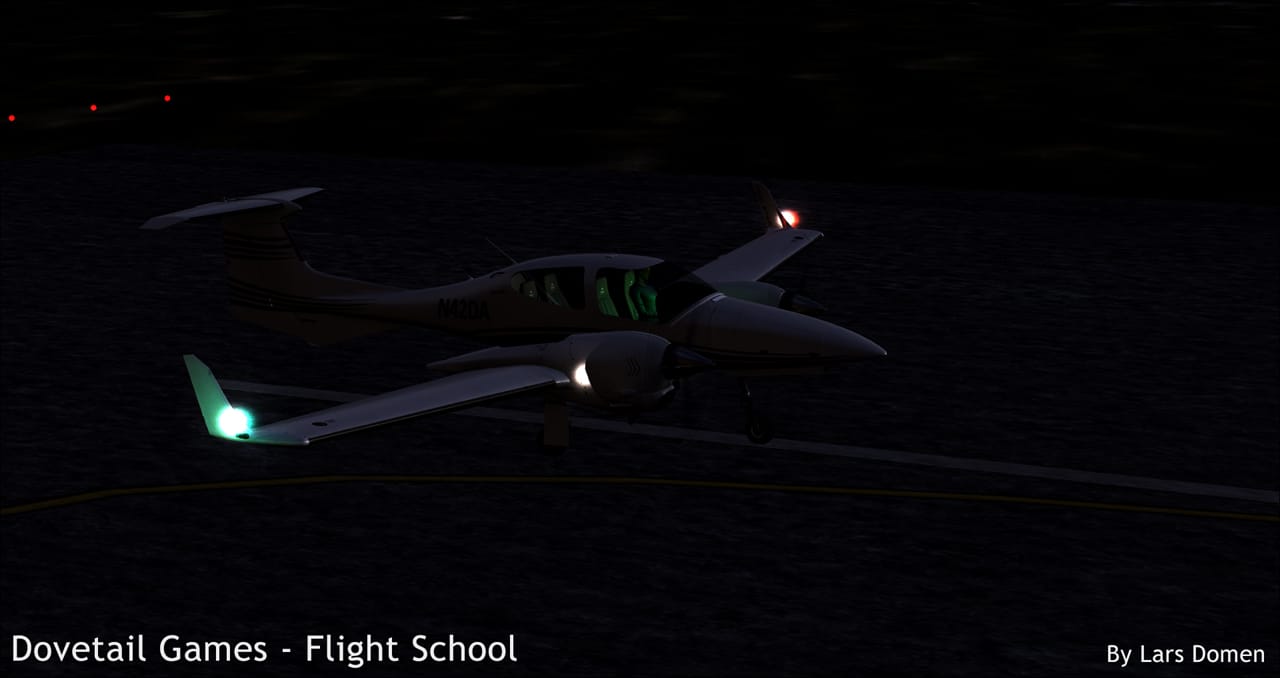 The aircraft lighting is horrible in all respects, with perhaps an exception for the DA-42’s cockpit flood lights. The exterior lights are huge, indistinct blobs, and badly positioned at that. And landing lights don’t do anything. Nothing is lit up with them on.
