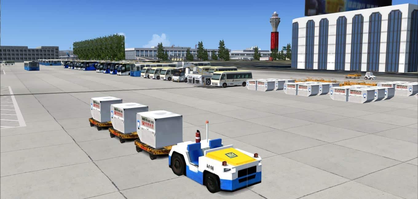 Now that the models have been imported with success, A_A Sceneries still needs to place the luggage carts and tugs, the bus, and other containers in many places all over the apron.