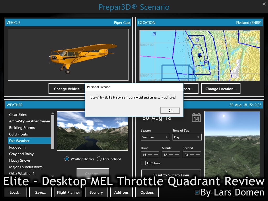 One annoying thing the plug-in does is show a warning that use of the hardware in a commercial setting is prohibited. It shows this warning every time I start P3D. Luckily, it disappears after a couple of seconds, or when you click ‘ok’.