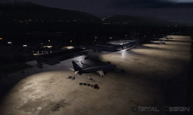 In P3D4, you will be enchanted by the detailed town and airport, featuring PBR materials and special wet effects on the apron.