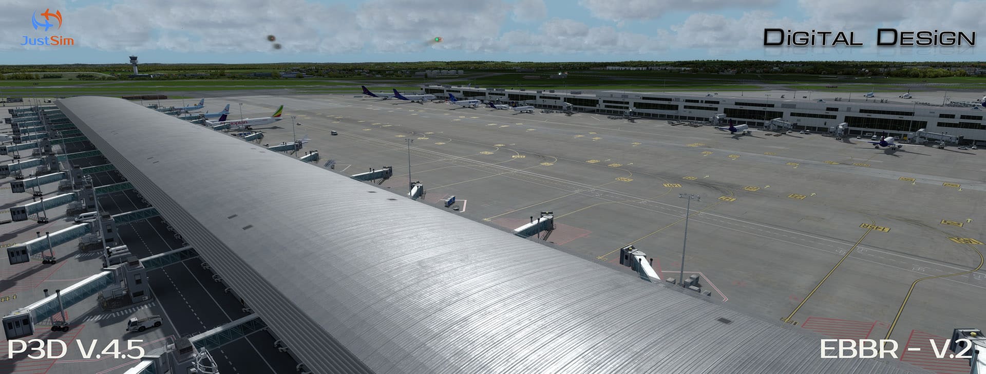 The enhancements by JustSim of the capital airport in Belgium include the ground polygon designed by following SDK requirements of P3D v4.4+, the addition of VDGS dock system and of the SODE animated jetways for A380.