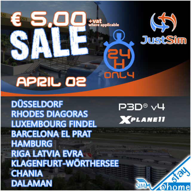 A wide selection of JustSim products for P3D, X-Plane and FSX are on SALE – for 24 hours only – at € 5,00 each (+VAT where applicable).