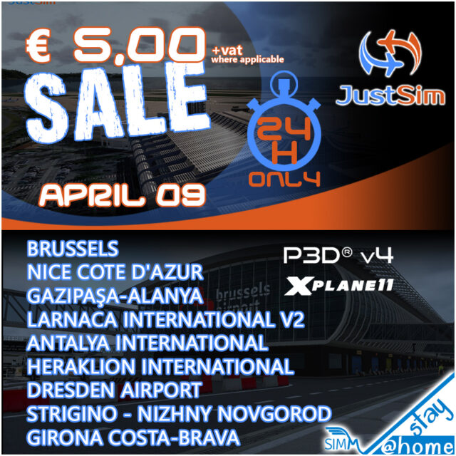 Planned to start tomorrow April 09th, simMarket informed their customers that another JustSim Sale will launch at EUR 5,00 (+vat where applicable) per airport. Any version P3D, FSX or X-Plane of the following airports will be available at reduced price :