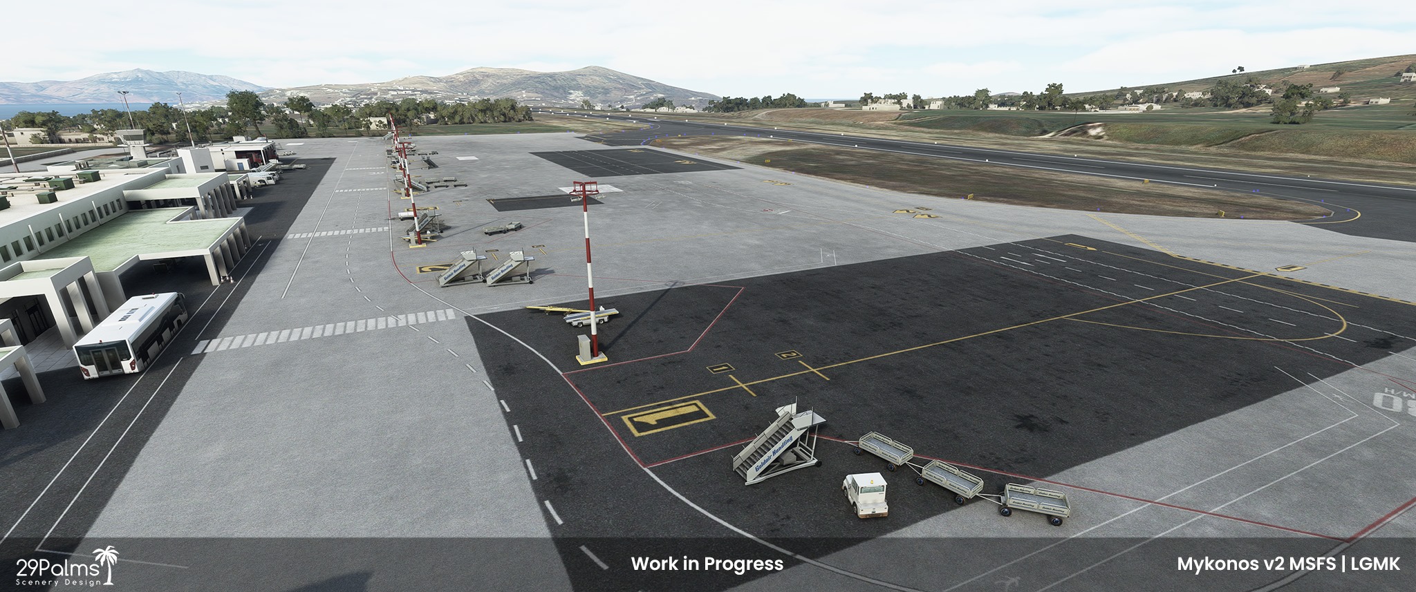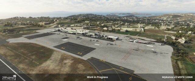 We can add a sticky note on the board of MSFS projects, with the announcement of 29Palms Scenery Design in the making of Mykonos LGMK airport, on the beautiful island located in the Aegean Sea.