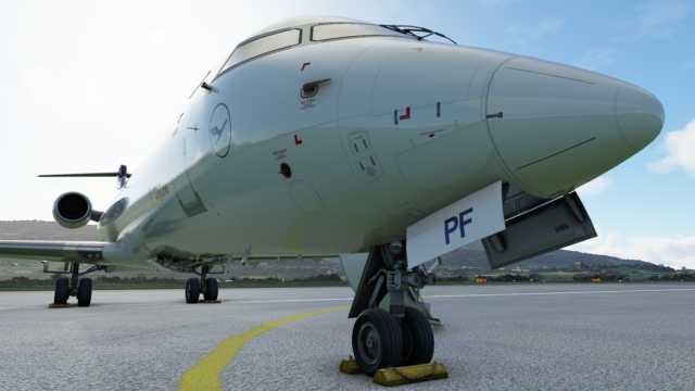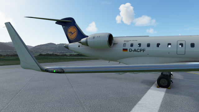 Open the door (great, you can’t do that with the standard MSFS jets “just like that”) and get out of the cockpit … the fine details of the stairs already put you in a good mood. The inspection at the nose too – all pitot tubes, statics, sevice doors, AoA sensors, ice detectors, ports are designed, the markings are high resolution, as well as the nose gear, there is everything on it that belongs to it. Wipers, lights, also antennas and outlets under the belly, the details of the baggage hatch flap, the fuel filler flap, every rivet counter is thrilled. Alexander Gerst (German ISS astronaut) was warned not to study aerospace engineering – he would then spend the rest of his life designing block door handles for Airbuses. It must have been something like that with the CRJ’s landing lights – the recreation in the Aerosoft model even includes the high-voltage warning signs hidden behind windshield glass. What doesn’t work (an MSFS bug, because I noticed this on the MB399 as well?): that lights which are turned on also do glow from a short distance. You can see the light effects on the aircraft and on the ground, but no bright headlights, they stay “off”, only from a distance they shine too.