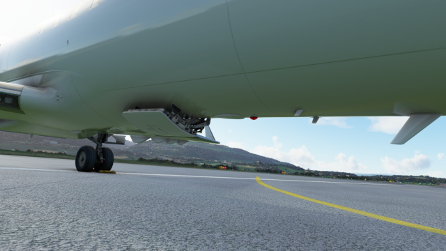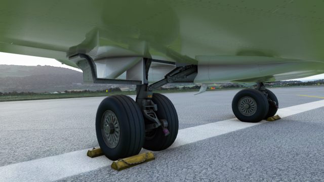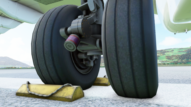 There is nothing to complain about on the right main landing gear, all lines and even the brake disks are shown. Also when looking into the landing gear bay: “thumbs up”. Up close, it becomes clear what my editor colleague meant by “angular” in the first impression (only available on the German site) – the actually round components are programmed as polygons. If that helps the fluidity of the process – I’m happy with that! We are not simulating maintenance on the landing gear, but flying. In case the designers want to get more detailed in the future: there is a pin on each wheel that shows the wear of the brake pads at a glance, they are part of the mandatory program for the walkaround.