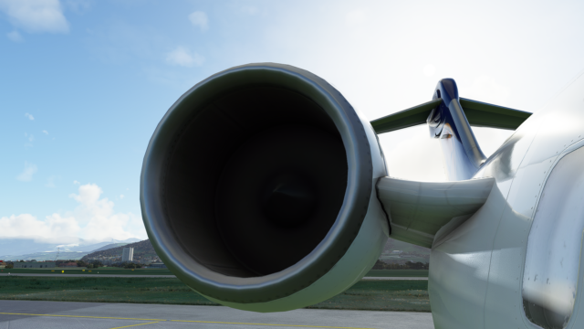 A look inside the engines … and again a disappointed “Oh”…. you don’t see fans, but a moving washed out texture that looks similar to a running engine. We are on the ground, the APU is running but the engines definitely are not. On large aircraft with prominent turbofans, like the Airbuses or Boeings, this would be a no-go in MSFS. The CRJ engines are so close to the fuselage and further up, above the wings, that there are hardly ever “natural” perspectives on the standing fans, so in this respect the omission is not a very serious mistake. In view of the otherwise so detailed implementation, the sparseness at this point is surprising, it does not fit into the overall picture. The jet pipe looks good again.
