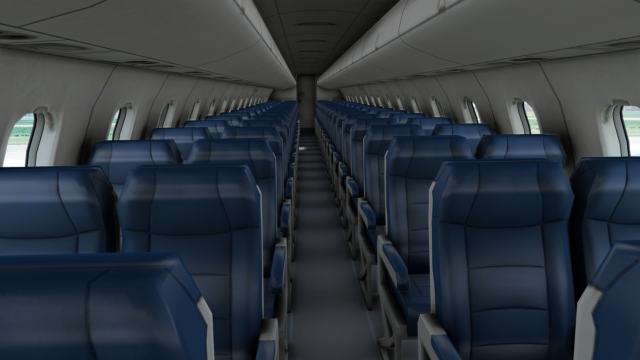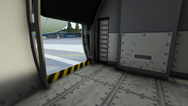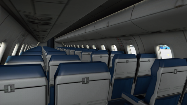Let’s take a look inside. A quick look – yes, not only the cargo compartments, the passenger cabin is modeled as well, albeit simple, one class fits all. But still. Irrelevant for the simulation as a pilot in the flight deck, you want to sit right at the front. Other providers had even modeled aircraft toilets (with functions), as a joke ok, but who needs something like that? Here Aerosoft has saved in my opinion in the right place.