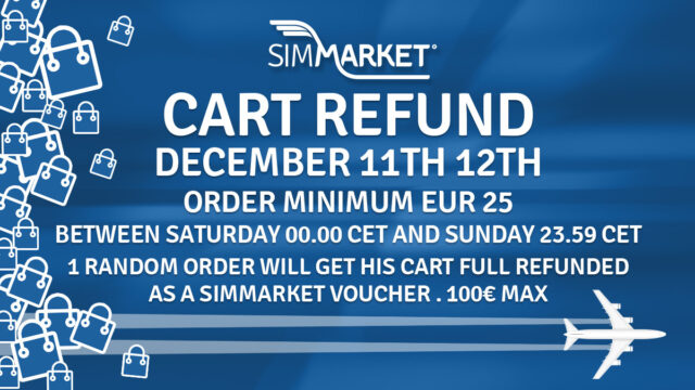 This weekend from Saturday 0.00 CET until Sunday 23.59 CET, fill your cart at www.simmarket.com with minimum EUR 25 and take a chance to get it FULL refunded by simMarket.