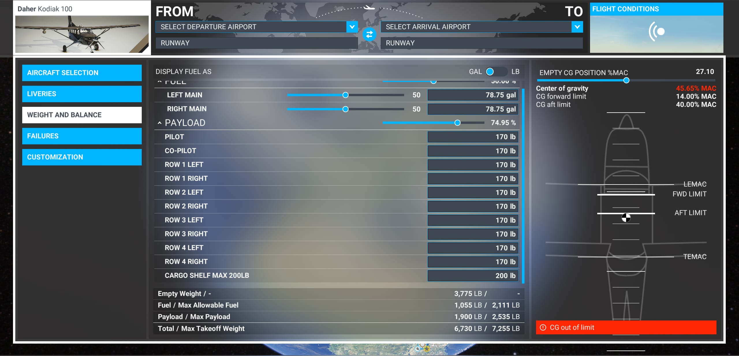 Tundra offers a standard passenger layout with eight seats. When fully loaded, it is easy to end up with an out-of-limit center of gravity so it is recommended to exercise caution when loading the aircraft. This holds true for every variant and interior but appears to be most prominent in Tundra. Also, it is crucial to keep the CG between 14-40% MAC.