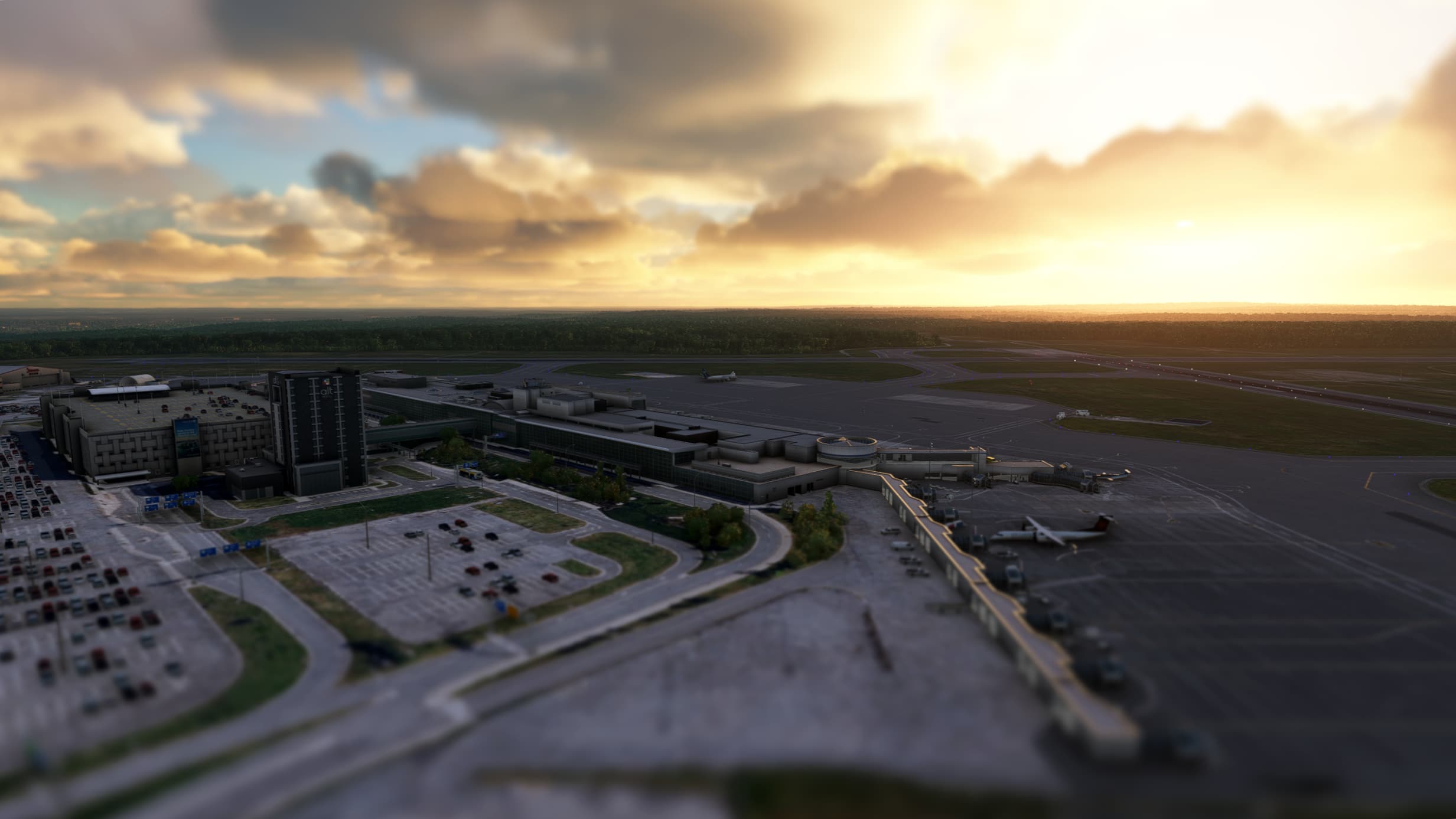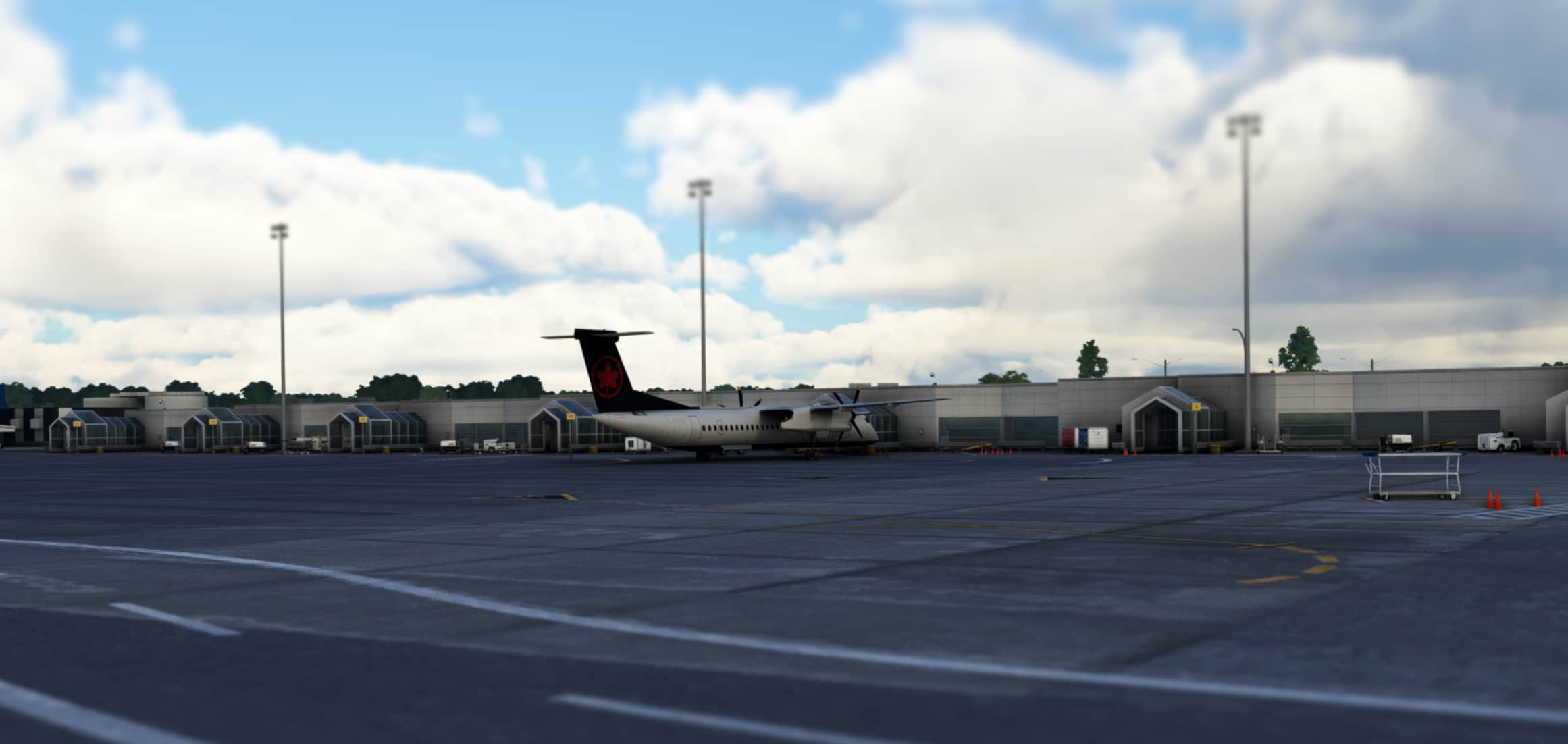 We looked inside, we looked outside, but then there is the ground. The mother of everything. The grass, the concrete, the roads and paths, the markings. I have seen so many, otherwise very convincing products fail right here. How could we ignore the ground, this rarely talked-about friend, the make or break of a product? In fact, an airport is mostly ground and buildings, right? Perhaps I over-simplified the question, but if you think about it, there is truth in the statement. If buildings are the heart of an airport scenery, I mean, the few dozen of them an airport normally hosts, then the ground that supports all of them deserves utmost attention as it is the soul of the place. Therefore, it is of great importance to make it look appealing. Starting with the right color, blending with the surrounding, everything matters. Worry you not, Halifax lives up to the expectation. Everything beneath our feet (or landing gear) is PBR and I cannot ignore how amazing the aprons look in the rain, the wet effect suits the airport particularly well.