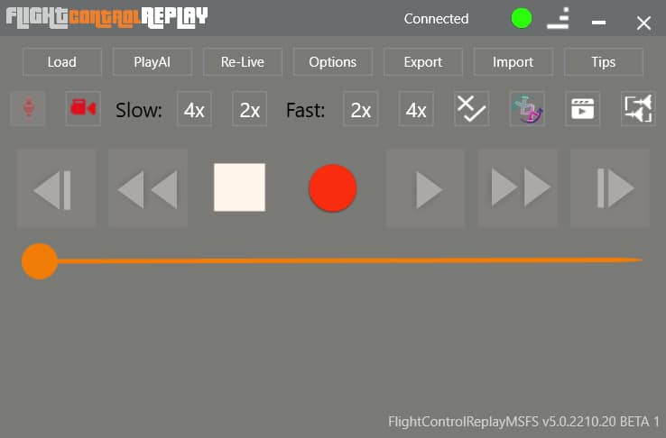 Another way to launch and control FlightControlReplay in MSFS is to use the toolbar directly from the simulator without leaving the full screen, or the main window. Main features are accessible there on a transparent overlay for direct control.