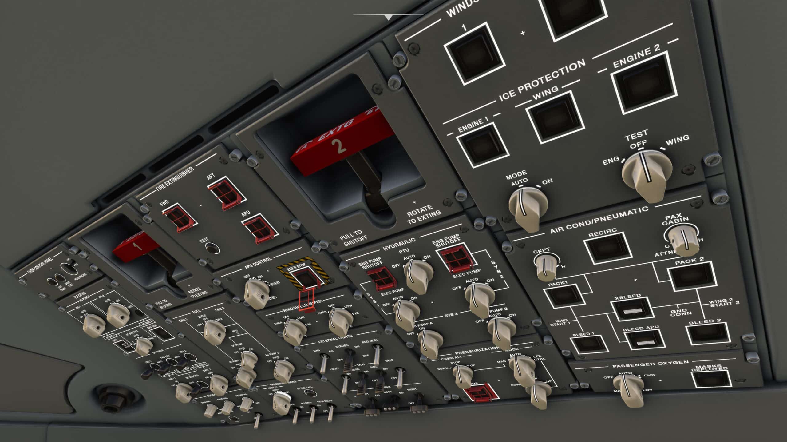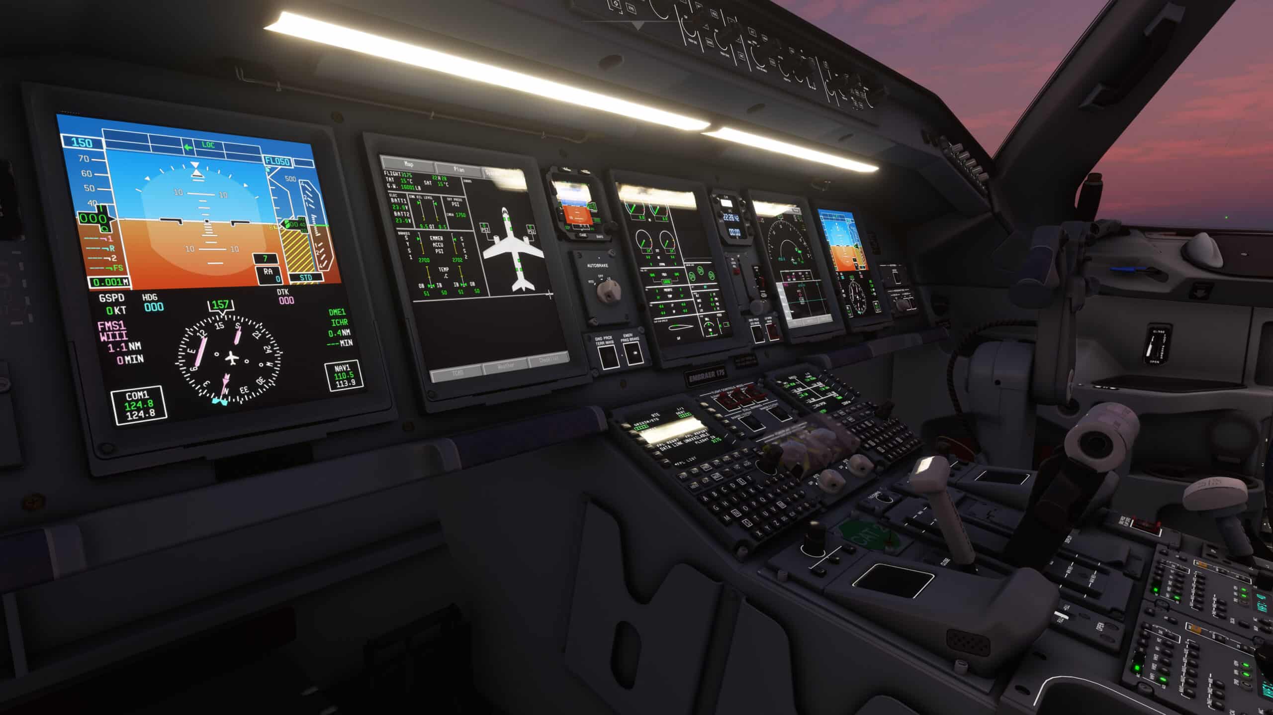 Among the simulated systems, the main pilot displays, EICAS, digital clock and Audio Control Panel are already functional. You will take note that the current development status of the other Automatic Pilot, and custom FMC allow to perform complete flights but there is not Vertical navigation management yet, and the FMC is not complete yet either. Remember that they decided to make it available with an Early Access program, and free updates to come later.