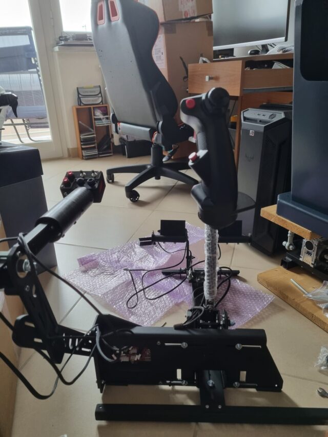 After assembling the rudder pedals, adjusting the height and depth of the collective to our liking and arranging the two pedal cables on the electronic motherboard, we are ready to fly! Our PFT Puma X is ready and we’re full of gummy bears!