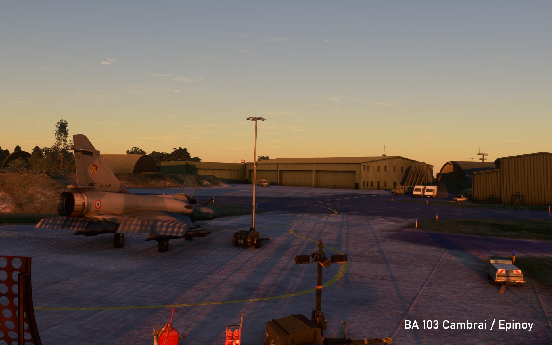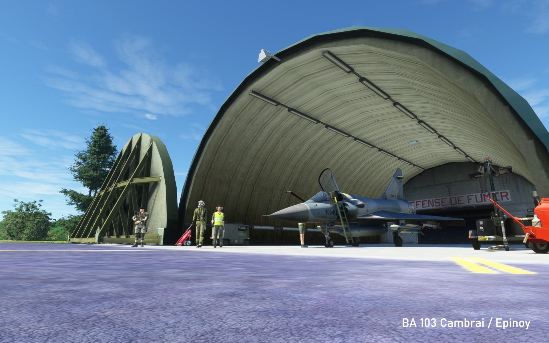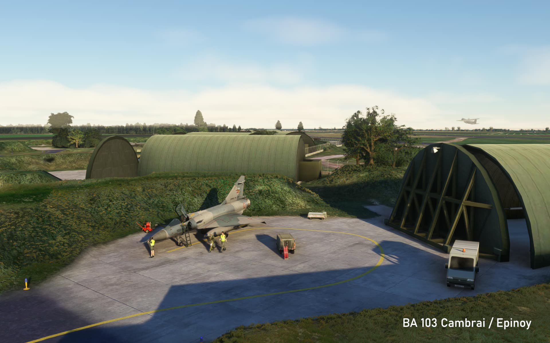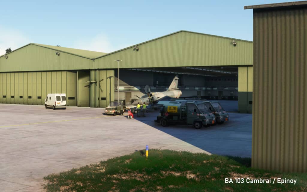 Skydesigners French Airbase 103 Cambrai/Epinoy MSFS is shows attention to detail by the makers with truly impressive details, inside the sheds, with with custom vehicles and equipments.