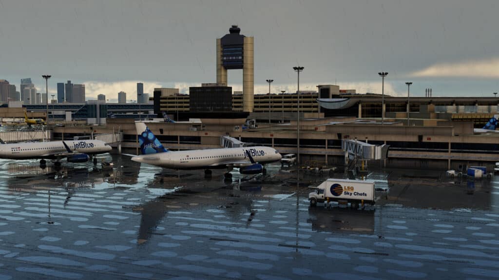 The scenery features an accurately modeled KBOS – Boston Logan International Airport, complete with detailed and textured buildings, airport infrastructure, and taxiways. The ground textures are custom-made, and the runways and taxiways are accurately textured to provide a realistic look and feel.