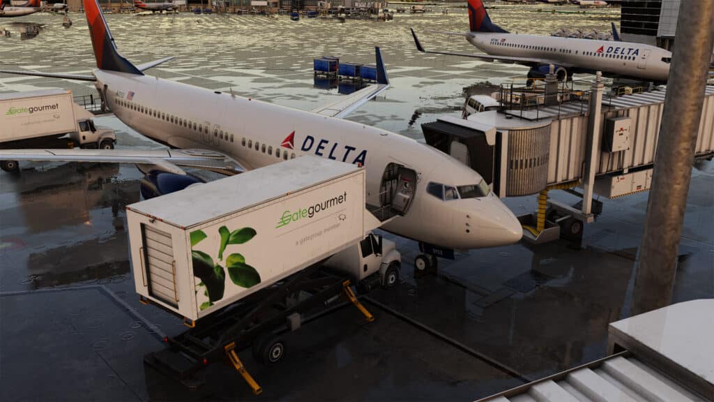 Furthermore, the add-on features animated airport vehicles and ship traffic, which uses the GroundTraffic plugin to bring life to the airport. The aircraft marshalling is also animated, and the jetways are operated through SAM, adding more realism to the airport operations.