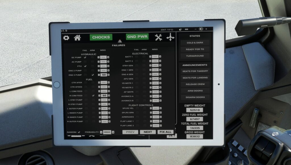 - – Failure controls added to EFB aircraft page – they can be set to fail instantly (FAIL) or armed to fail after X number of minutes (ARM). There is also a random failures option with selectable probability for those occurring.