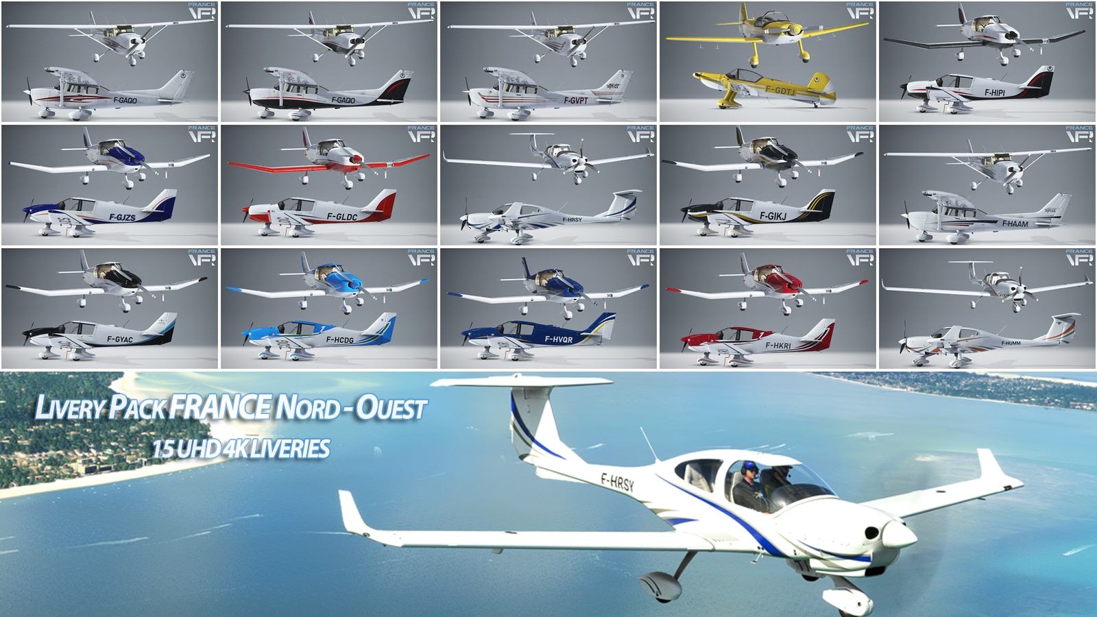 France VFR launched at SIMMARKET their new Livery Pack France North-West for Microsoft Flight Simulator. This pack offers 15 ultra high-definition 4K liveries for popular GA aircraft like DR400, Cessna 172, CAP 10, and DA40NG. These liveries faithfully replicate the designs of flying club airplanes from airports covered by VFR FRANCE North-West add-on. With 4K ultra high-resolution textures, the pack ensures stunning visual detail.