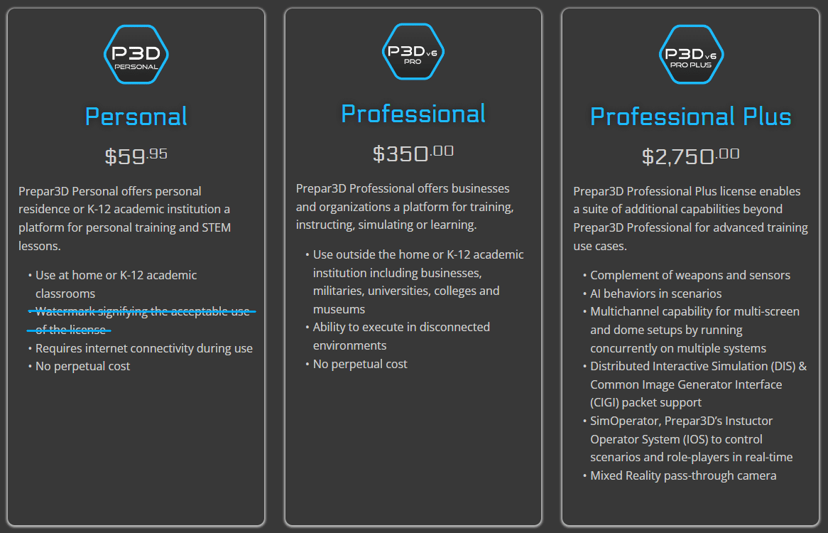 Lockheed Martin has made significant updates to the license types and pricing structure for Prepar3D 6, their popular simulation platform. The Academic license has been replaced with a Personal license, allowing individuals to use Prepar3D 6 within their personal residence. The Personal license requires internet connectivity during use. For business, military, and college/university use, the Professional or Professional Plus license is still required. The prices for Prepar3D 6 licenses have been adjusted accordingly. The Personal license remains at $59.95, while the Professional license costs $350, and the Professional Plus license is priced at $2,750. Developer licenses are available for $9.99 and $50 per month for Professional and Professional Plus, respectively. Previous versions of Prepar3D will also adopt the new pricing structure upon the release of Prepar3D 6.