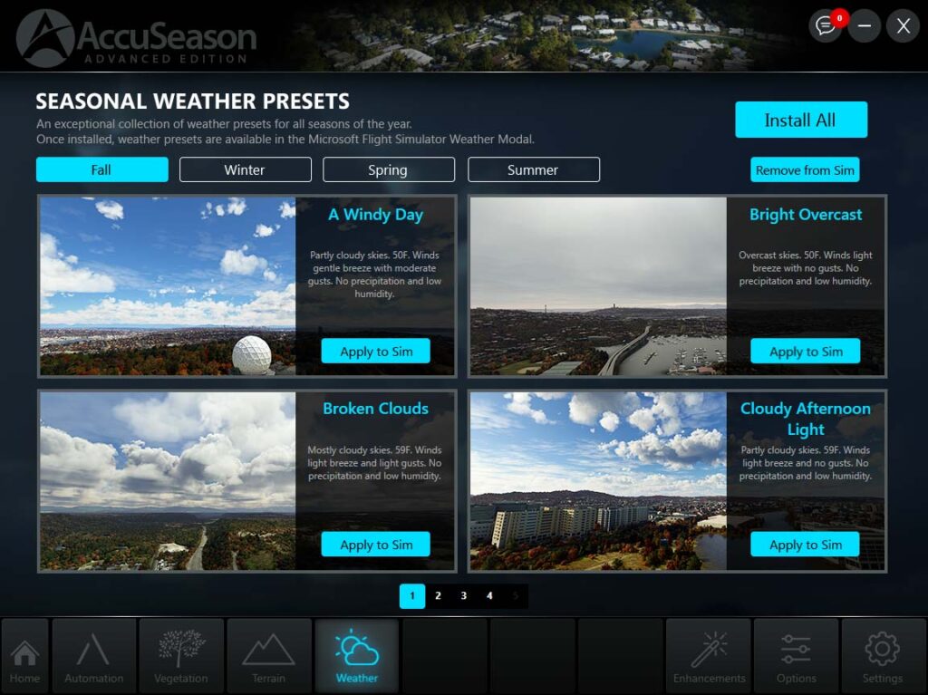 With the addition of Weather Scenarios in the AccuSeason Advanced Edition, you can now choose from over 38 season-oriented weather presets. Each preset is a work of art, meticulously crafted to capture the unique charm and challenges of the climate during that time. Imagine flying through a snowstorm in winter or basking in the warmth of a summer’s day—all while the vegetation and terrain features harmonize with the changing weather patterns.