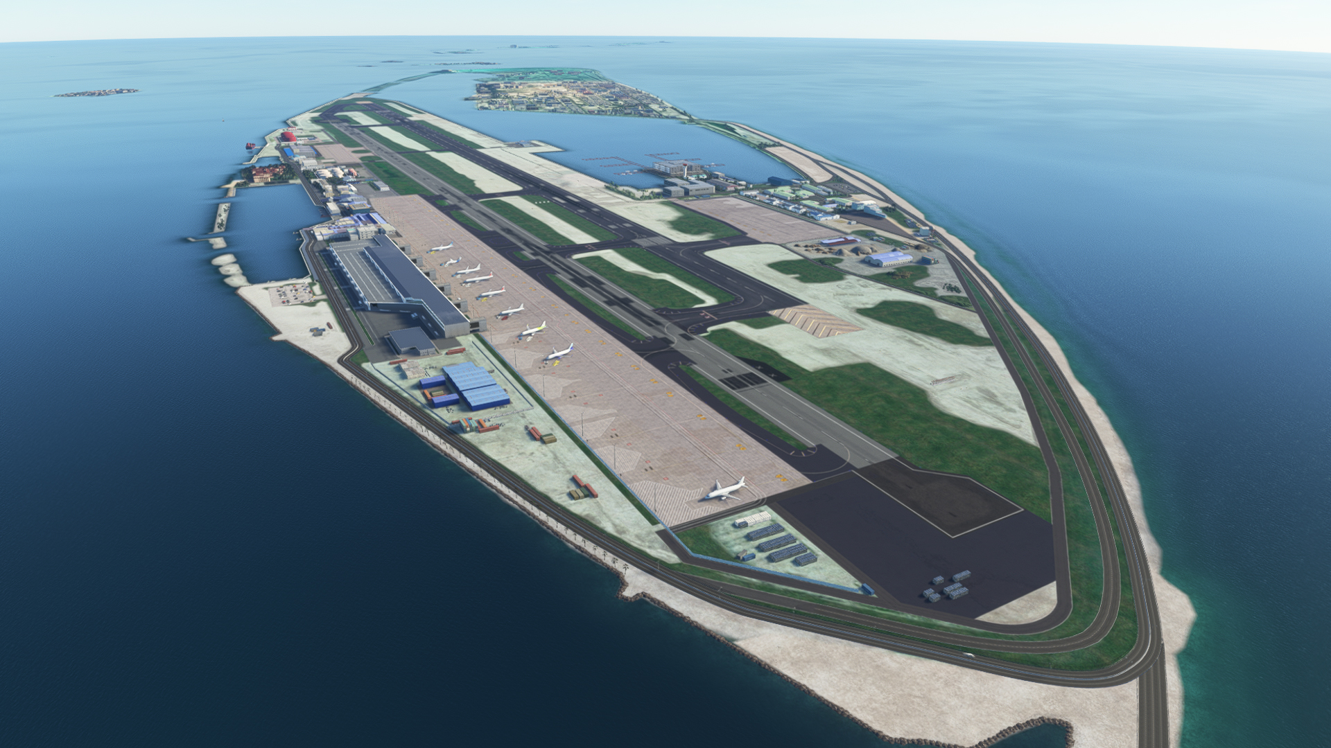 The Velana International Airport scenery in MSFS boasts numerous impressive features that enhance your flying adventures in the Maldives. You’ll find a new passenger terminal with detailed interiors, a striking control tower, and a fully operational seaplane terminal with docks. The airport’s runway, taxiways, parking positions, and aprons have been updated, along with a comprehensive representation of the surrounding buildings, including a VIP Lounge, a charming Shopping Center by the sea, cargo facilities, the Hul Hule Island Hotel, Masjid Sabeel mosque, and even the China Friendship bridge. The scenery also includes custom night illumination and LOD optimization for MSFS2020, ensuring a stunning and immersive experience.
