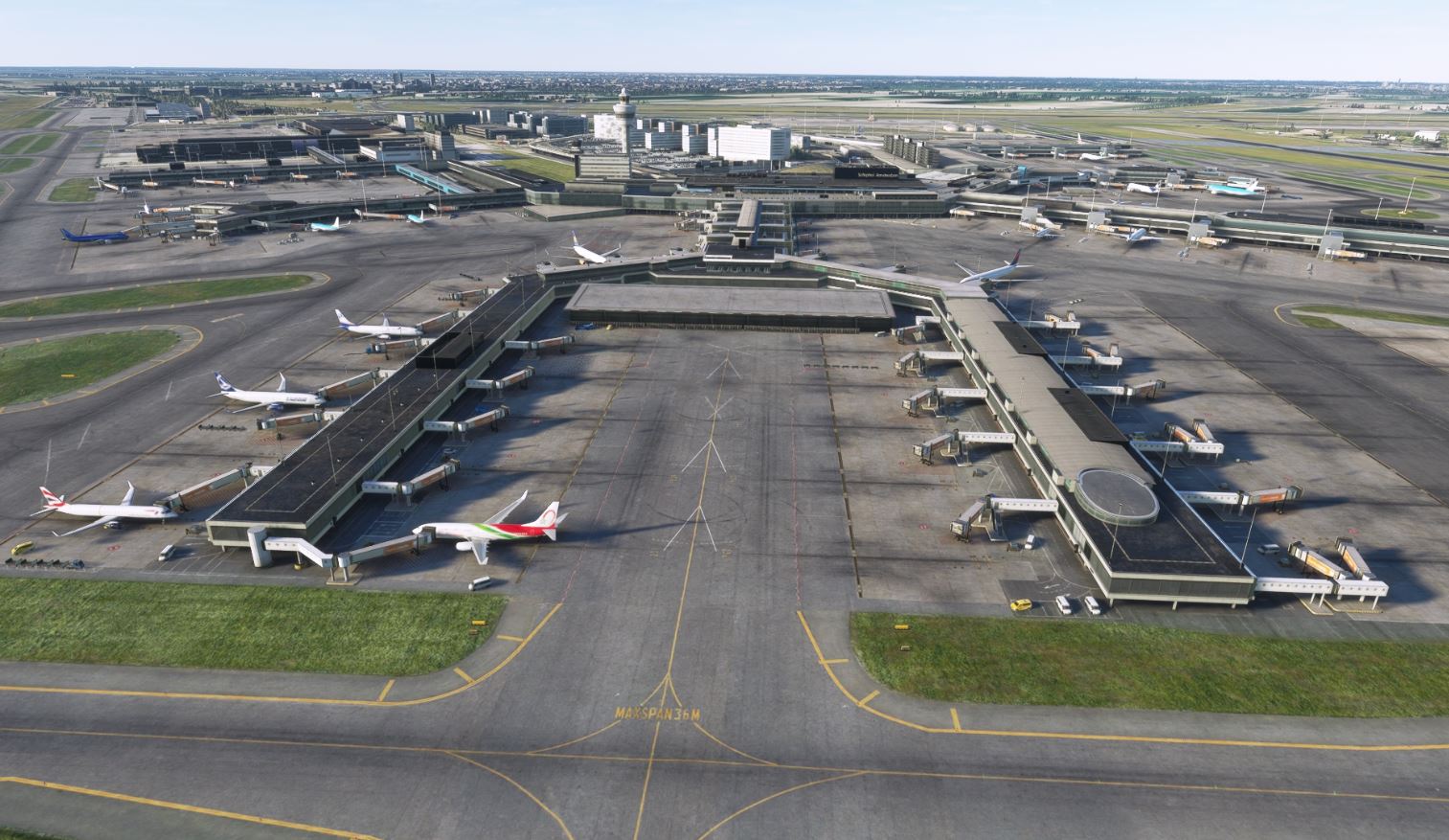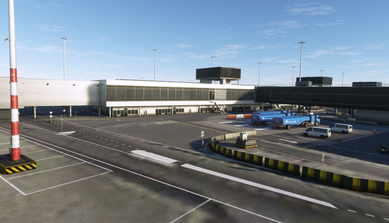 The most imposing structure here is the large single passenger terminal. Unlike many other major airports that have multiple passenger terminals there is just the one main terminal providing access for all passengers to the various piers. The building has been meticulously recreated in great detail. I was especially impressed with the way they captured the weathering and aging of various building materials just as you would expect to see if you were actually there in person. Another way they enhanced the quality of the visuals was by modelling any 3 dimensional wall features such as doorways and windows and any asymmetrical roof lines. They also included other features such as roof mounted ventilation systems, wall mounted lights, drainage piping, structural beams and signage.