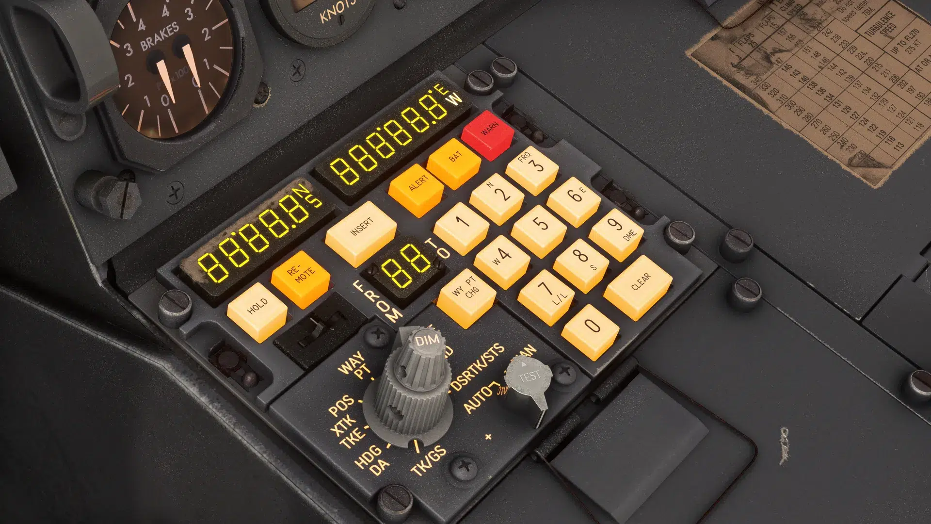 This update covers the centre pedestal, starting with the forward section that features the Carousel IV Inertial Navigation System’s (INS) Control Display Unit (CDU) on either side. These data displays have been individually modeled for authenticity. For modern alternatives, users can swap these for the UNS-1 FMS. Moving rearward, the pedestal includes stabilizer trim wheels, a large speedbrake lever, a combined flap/slat lever, conventional throttle levers, and various switches and buttons for essential controls like fuel cut-off, parking brake, and take-off config test.