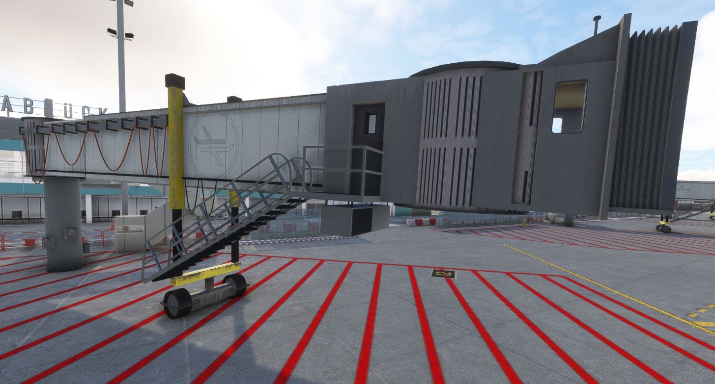 However, I stated minimum because I think they were lacking in the quantity and diversity of objects you typically expect to find in the apron and aircraft parking stand areas; what is needed to support aircraft boarding or deplaning processes. There were a few baggage carts, tugs and GPUs along the apron but I felt they could have had more and the ones they did include were basically isolated to a small cluster near parking stand 10. I realize that this is not a large busy airport however it did seem like there was something definitely lacking. The overall scenery ambience and sense of realism when pulling into a parking stand would have benefitted from the addition of a larger quantity and variety of the objects normally found in these areas.