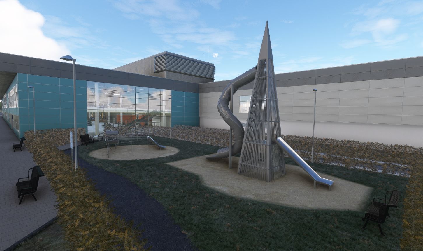 The street side does have a few interesting items that peaked my attention while exploring the area; there is an outside playground that has a unique climber/slide. There is also some sort of sculpture here along the roadway.