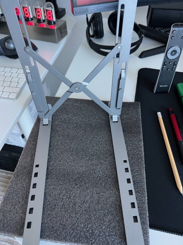 The unit comes with a clever, foldable metal stand, which is included separately in a linen bag. This looks like an elegant solution that creates a high-tech feeling on the desk.