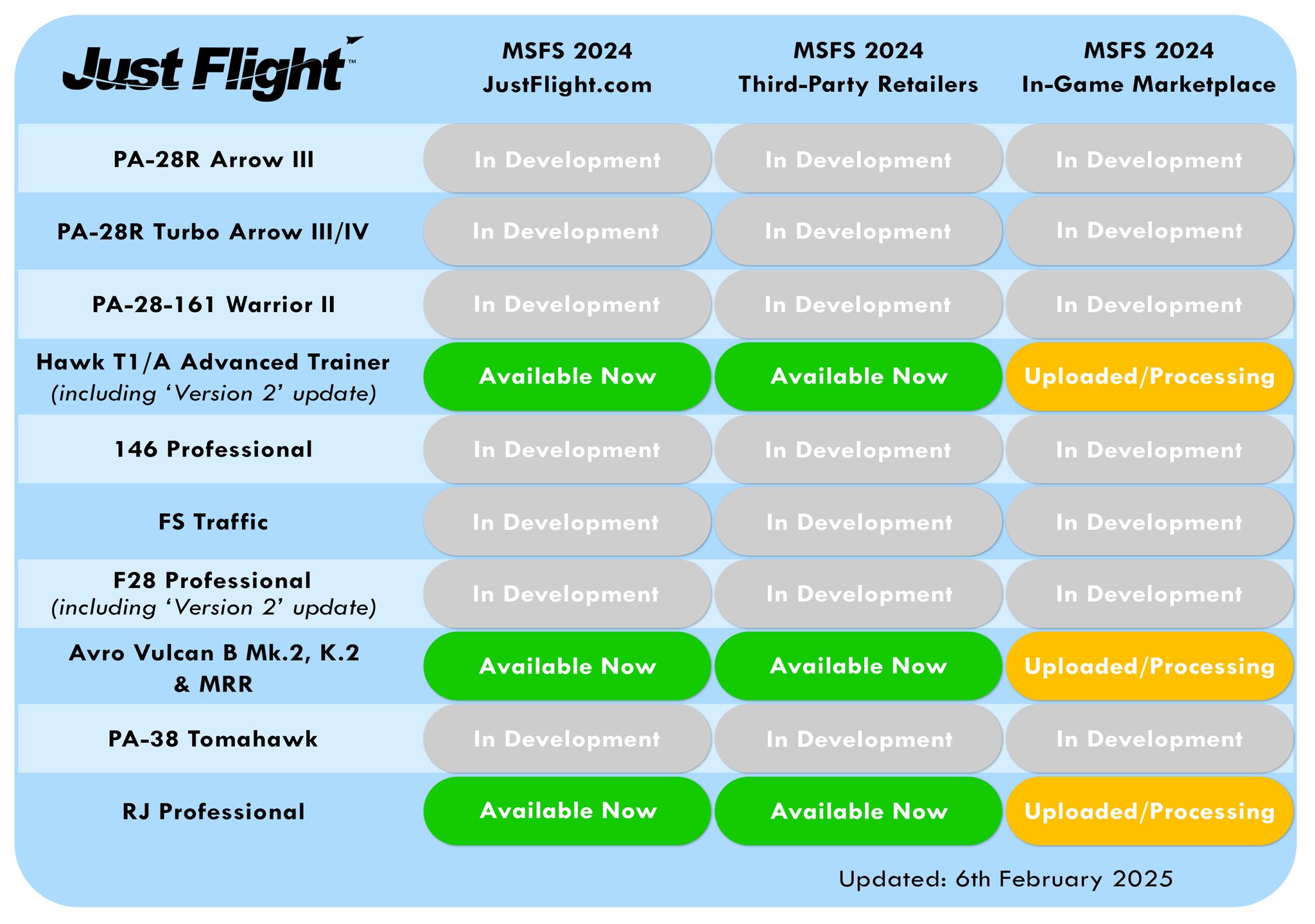 Just Flight has compiled a compatibility table to keep users informed about which of their add-ons have been updated for Microsoft Flight Simulator 2024. This table serves as a quick reference for checking the status of each add-on across different marketplaces. To stay updated, Just Flight recommends bookmarking the page, as they will continuously update the table whenever changes occur.